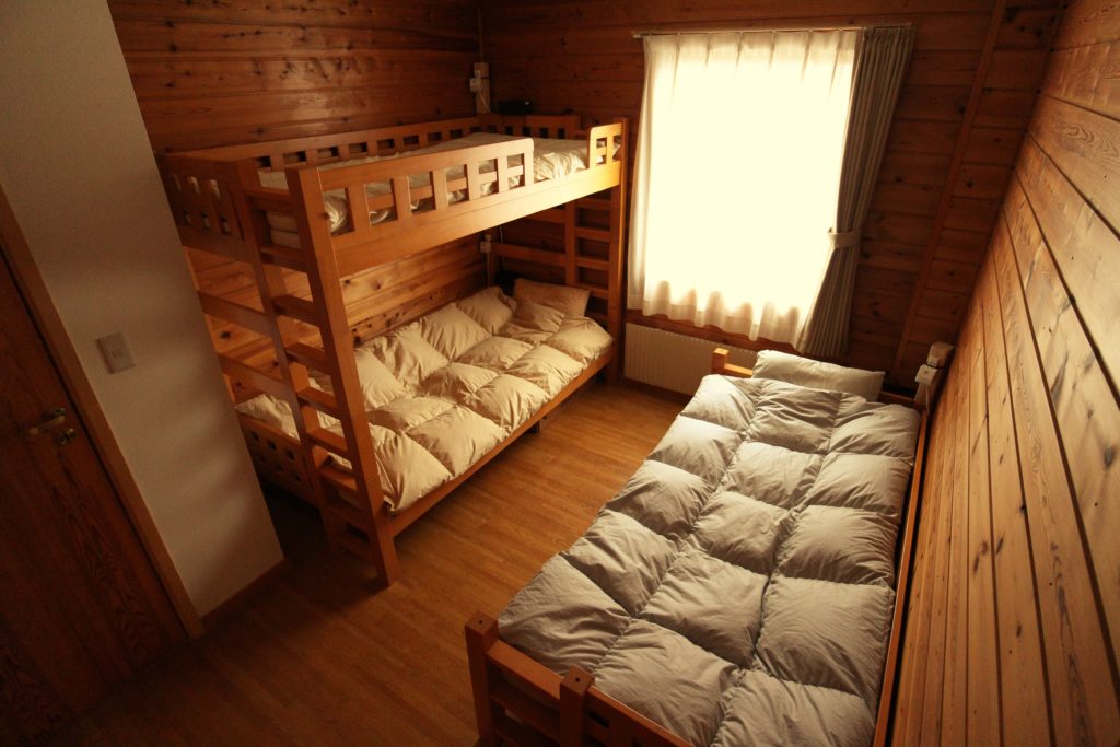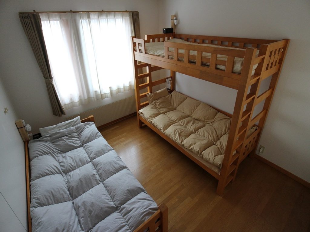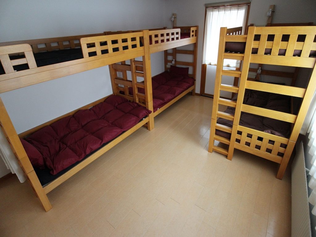 男女別のドミトリー形式のお部屋です。3人、3人、6人部屋があります。2段ベッドとシングルベッドの組み合わせです。とても丈夫なベッドで軋み音も少なく快適です。羽毛布団でぐっすりとお休み下さい。